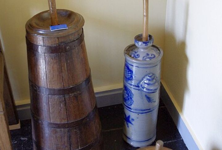 These washing machines were usually located wherever water was available, such as in kitchens or even outside. After washing clothes, you manually pushed them through two spinning rollers to squeeze out water. The best part? Some models had attachments that turned them into butter-making machines when needed.